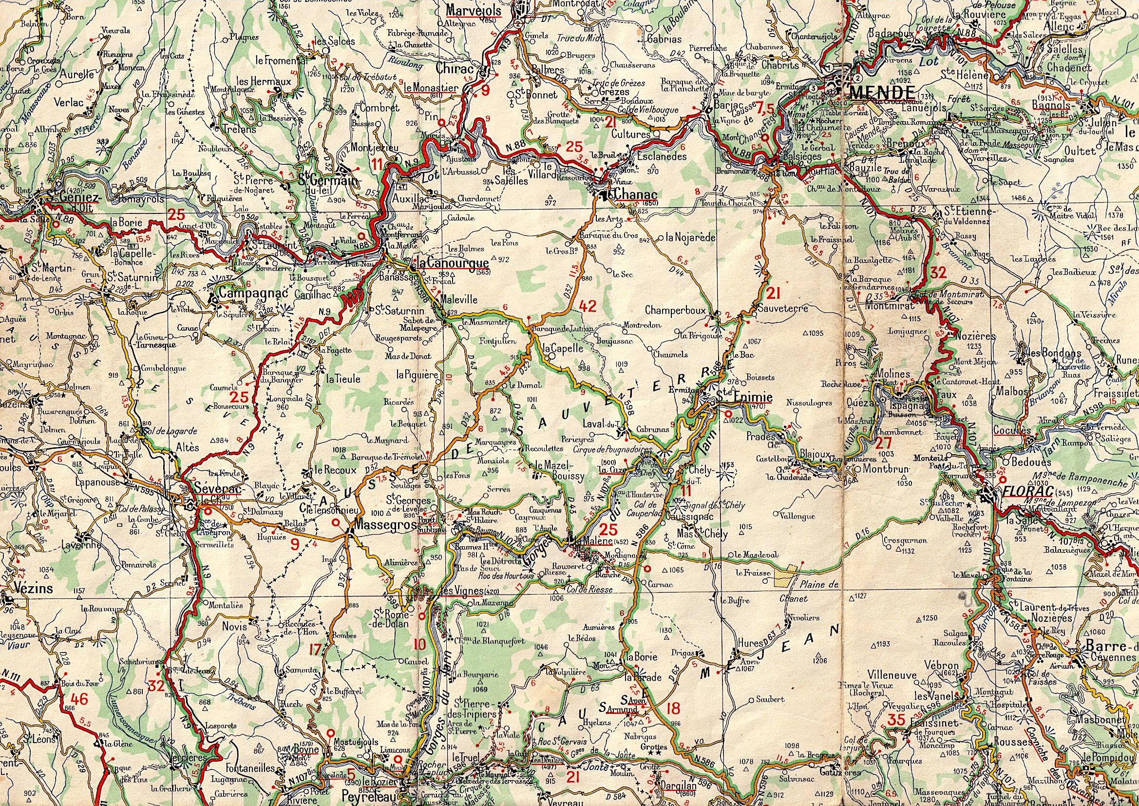 Évolution du tracé des gorges du Tarn sur la carte Michelin de 1920 à 2022