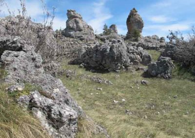 Vous pouvez démarrer la journée en cheminant à travers le sentier d’interprétation du karst de Nîmes-le-Vieux. Entre 100 Ma et le quaternaire, l’eau de pluie qui s’est infiltrée dans les fractures du calcaire a dissous ce dernier formant des galeries et cavités. L’érosion des roches sus-jacentes et d’une partie des calcaires a mis en relief ces rochers dissous appelés lapiés.