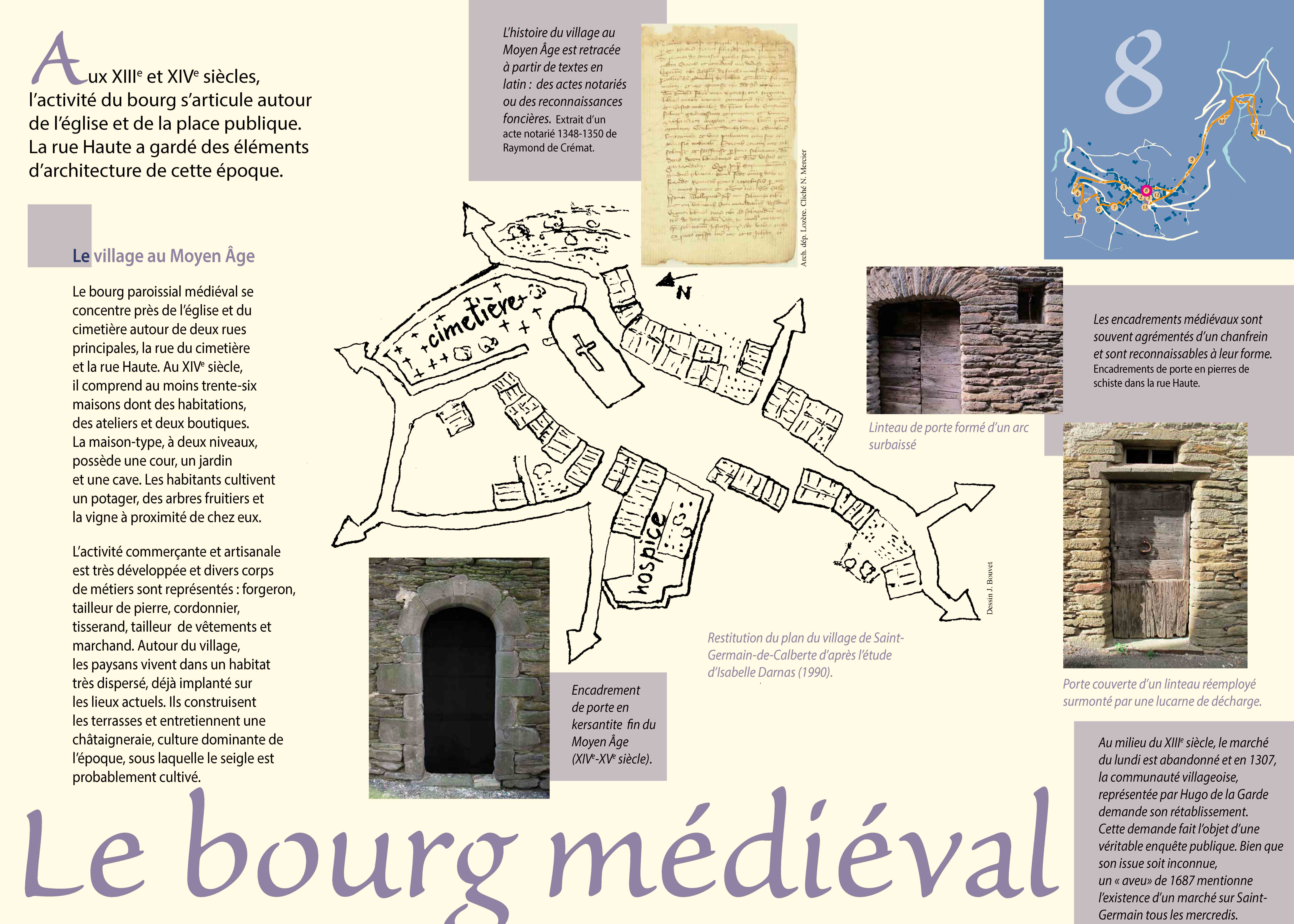Une autre partie des panneaux présente l’histoire de Saint Germain de Calberte depuis son implantation, attestée dès le Moyen-Âge. On y retrouve les principaux événements historiques qui ont marqué les Cévennes, comme le développement du protestantisme, la Guerre des Camisards, l’âge d’or de la soie du XIXe siècle, les deux guerres mondiales, l’exode rural au XXe siècle…