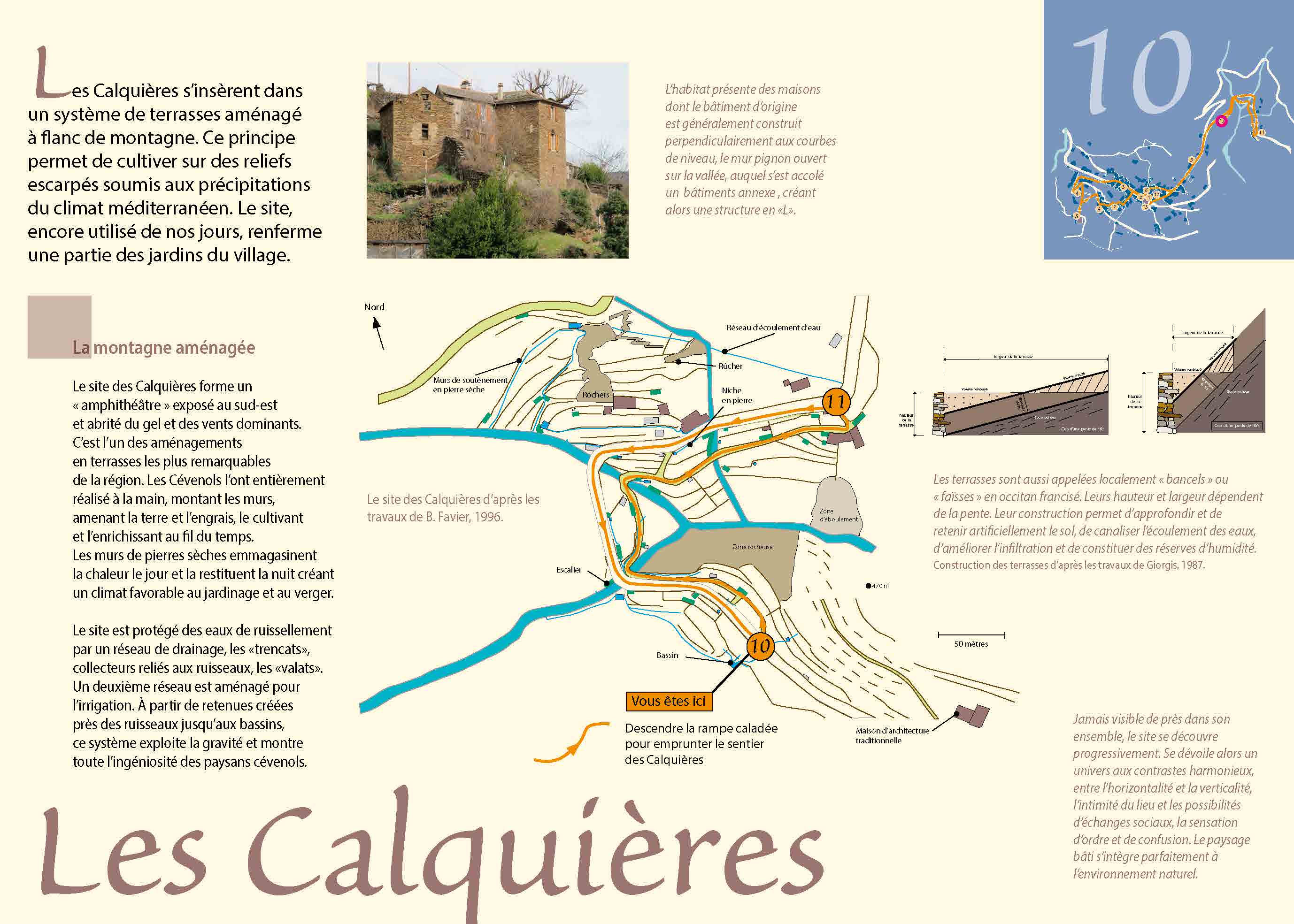 Certains d’entre eux présentent le travail remarquable de la pierre réalisé par les Cévenols qui, au fil des siècles, ont aménagé les montagnes, construit les terrasses, les canaux d’irrigation, les chemins d’accès, l’habitat… Le quartier des Calquières est un exemple d’aménagement en terrasses les plus remarquables de la région que l’on peut découvrir en empruntant le sentier qui traverse le site. L’artiste iranienne Shirine Afrouz a rendu hommage à ces habitants qui vivent en harmonie avec la nature à travers un monument.