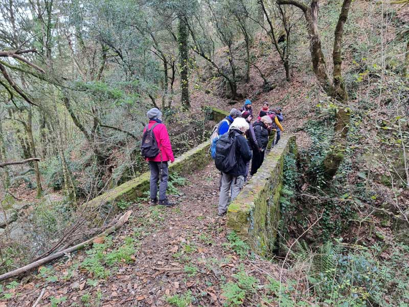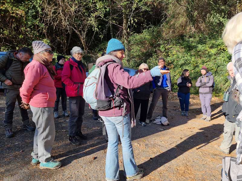 Après nous être garés au bout de la route, nous présentons le bassin versant de Valescure, sa géographie au sein de la Vallée Borgne et sa géologie. Marc nous explique le rôle des tancats, ces petits barrages aménagés par les anciens dans les valats pour limiter l’érosion des cours d’eau, freiner les crues lors des épisodes cévenols et retenir l’eau aux périodes de sécheresse. Nous présentons le projet de leur réhabilitation qui a été réalisé entre 2003 et 2005 et du suivi scientifique qui s’en suivi pour étudier leur rôle dans la régulation de l’eau des valats.