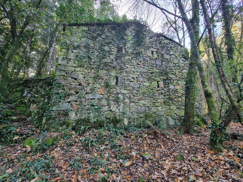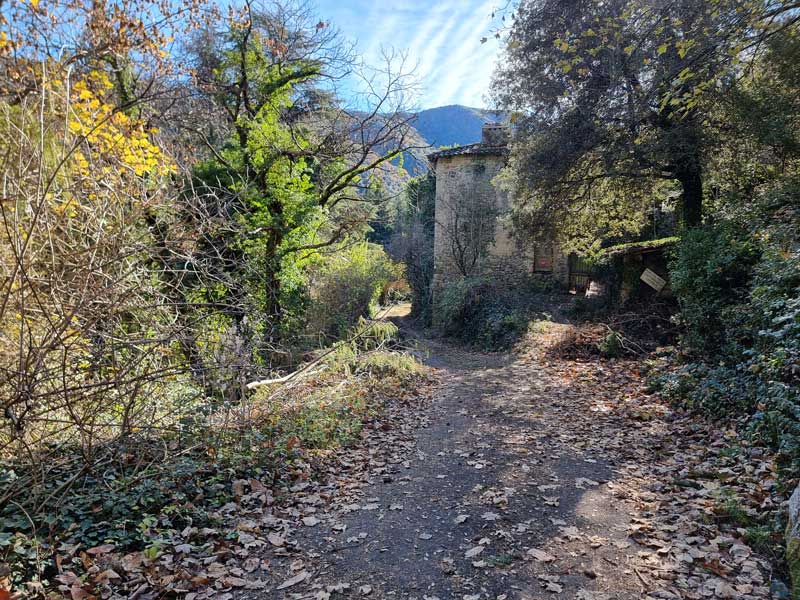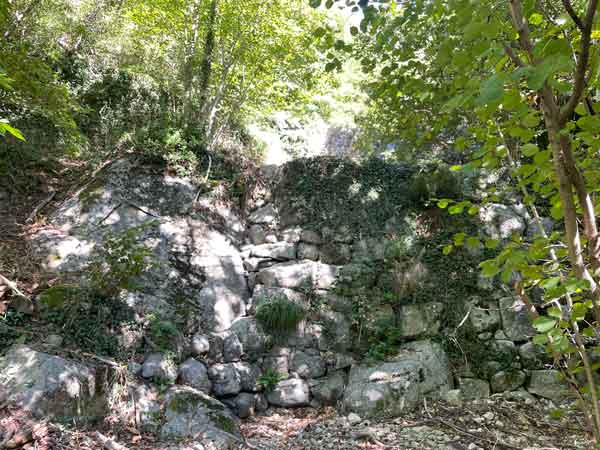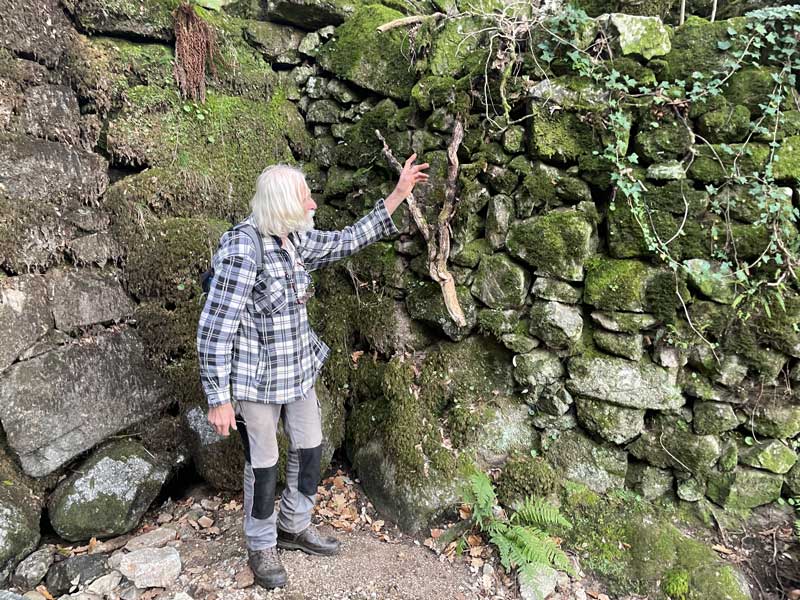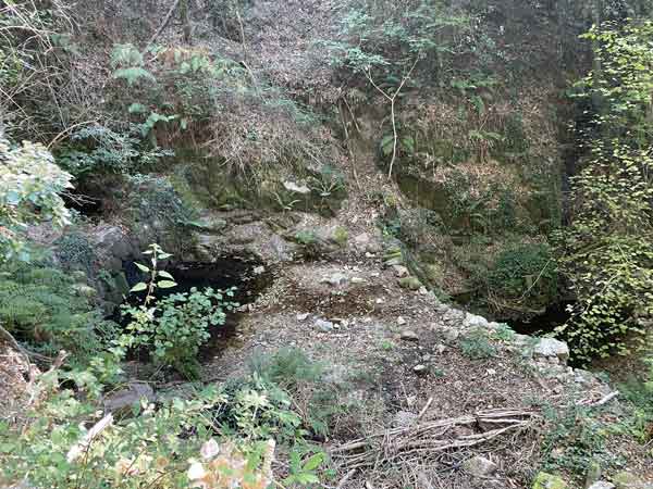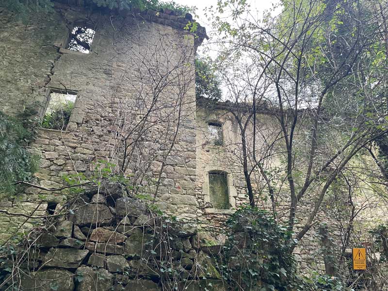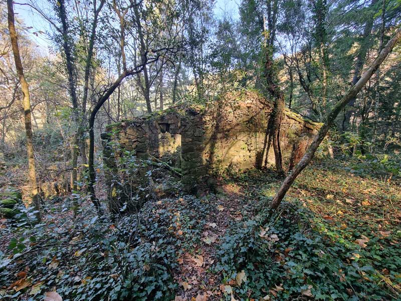 Revenant quelque peu sur nos pas, nous prenons à gauche le PR en jaune pour atteindre la Jasse, ancienne ferme en ruine avec ses dépendances, encastrée dans un système en terrasses magnifiquement conservé. Regagnant le PR, nous atteignons un tancat de plus de 5 m de haut, dont la partie supérieure se trouve directement au niveau du ruisseau. La terrasse est remplie de limons, déposés au fil des inondations lors d’épisodes cévenols. Nous découvrons de la kersantite provenant probablement d’un filon au-dessus. La carte de 1552 nous indique en ce lieu l’existence d’un moulin aujourd’hui disparu.