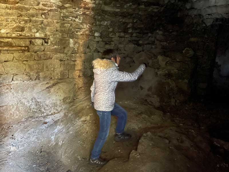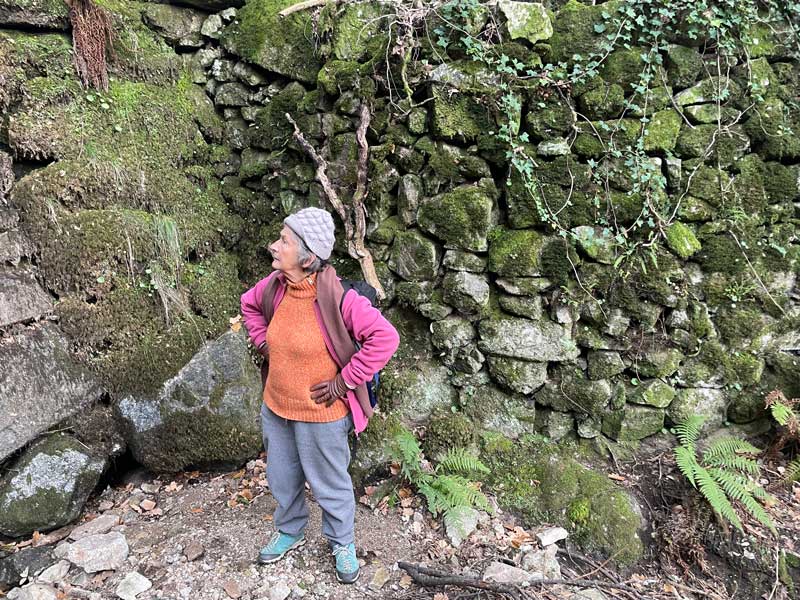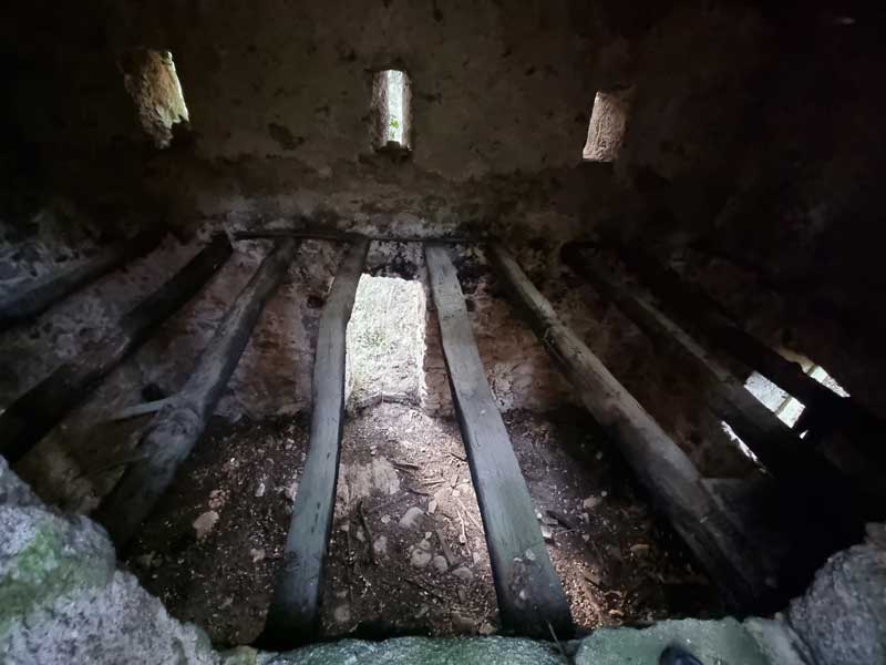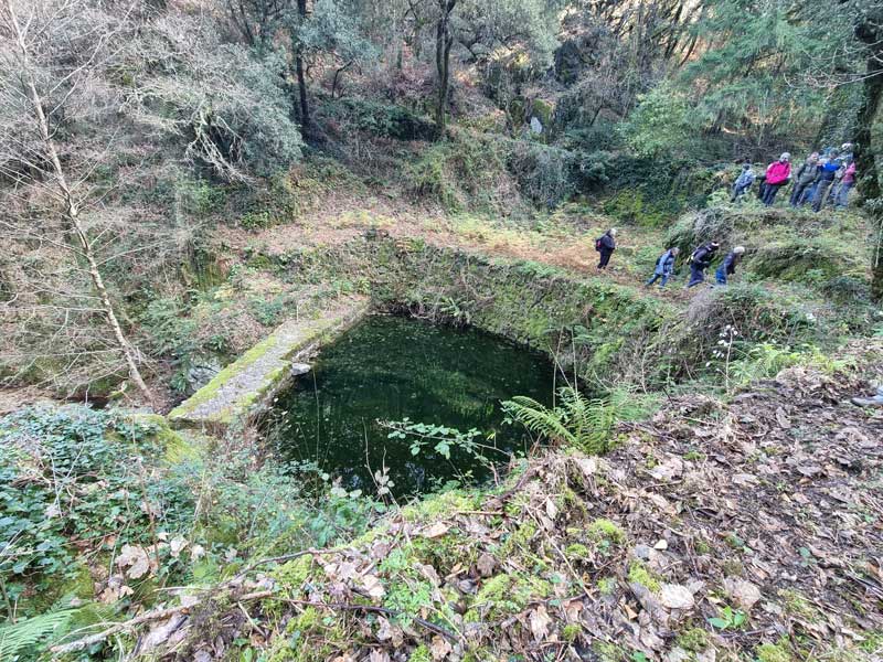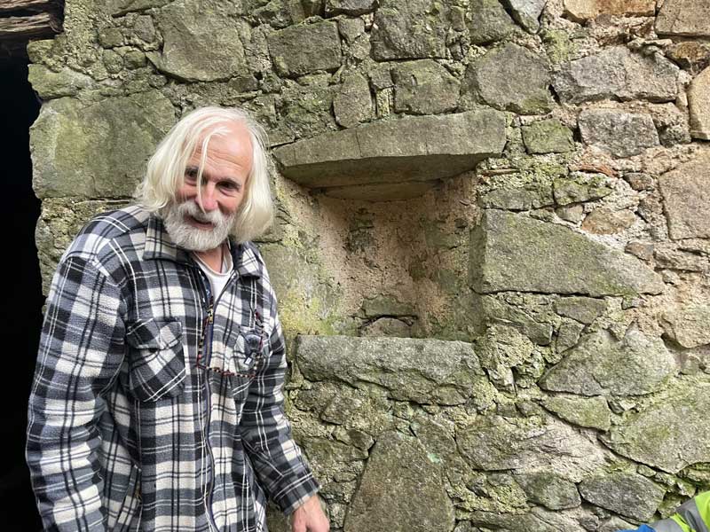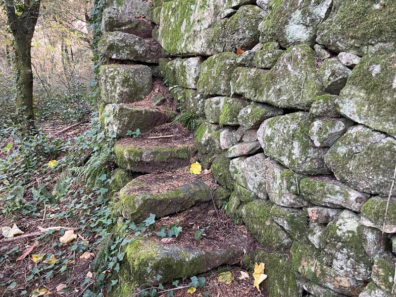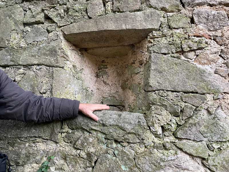 Continuant le sentier, nous passons sur un tancat et un système de terrasses bien conservées. Nous arrivons au hameau de Fayssole construit en granite et en gneiss, Marc nous expliquant la taille de pierre du gneiss, la fabrication des lauzes, le fonctionnement de la clède… Nous enquêtons sur la fonction d’un reste de voûte que nous attribuons finalement à une fontaine ou lavoir, alimentant un réservoir d’eau en dessous. Après l’exploration des lieux, nous redescendons vers le gué, le château et les voitures, encore émerveillés de cette civilisation ancestrale cévenole en partie réhabilitée de nos jours.