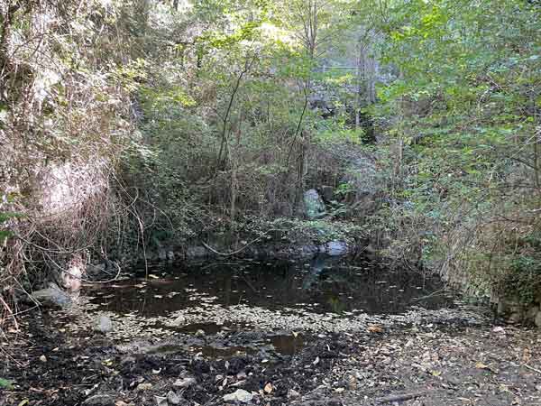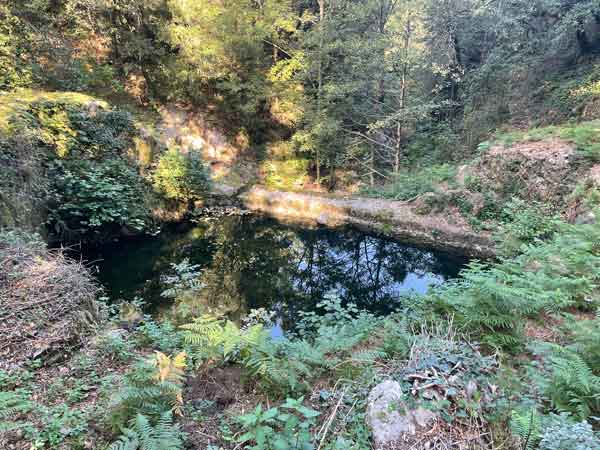 Une digue permet de dévier l’eau du valat et de la canaliser pour remplir une gourgue qui servait de réservoir. Ces gourgues permettait autrefois d’alimenter un béal pour irriguer les terrases ou faire fonctionner des moulins. Après l’avoir exploré, revenir sur vos pas et emprunter le sentier d’interprétation de Valescure en suivant le PR balisé en jaune. Vous arrivez au gué.