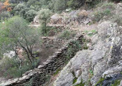 Des ruines ne comportant aucune fenêtre ni pignon sont celles d’une ancienne jasse, bâtiment ayant servi de bergerie avec un toit à une seule pente. En face, on observe des terrasses construites sur les rochers. Puis, le sentier longe un beau système en terrasses délimité par un mur.